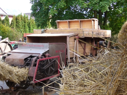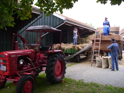 Mit unseren historischen Dreschmaschinen wird das Getreide von den Mitgliedern der Schlepperfreunde gedroschen und das Stroh mit Hilfe einer Oldtimer- Strohpresse (Bj. 1937) zu Ballen gepresst.