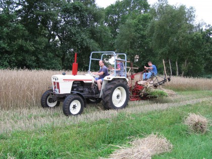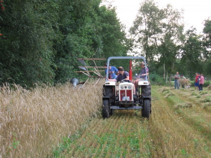 Später wird das Getreide zur Mühle Hahnentange transportiert. Dort findet dann im Oktober ein historisches Dreschfest statt, an dem die Schlepperfreunde aktiv teilnehmen.